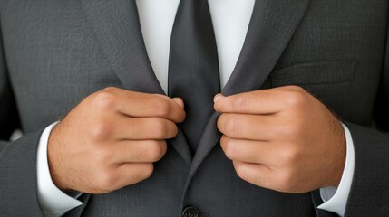 Man in Suit Adjusting Tie - A Study in Professionalism and Style.