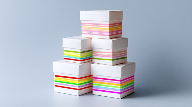 Stack Of White Cardboard Gift Boxes With Colorful Ribbons Tied Around Each One Arranged On A Light Blue Background Creating A Staircase Effect With Soft Studio Lighting