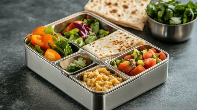 Nutritious tiffin box for kids in India with chapati, dal, and salad, with room for text.