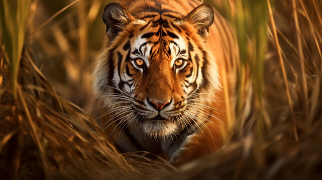 Intense gaze of a majestic bengal tiger in shadowy habitat