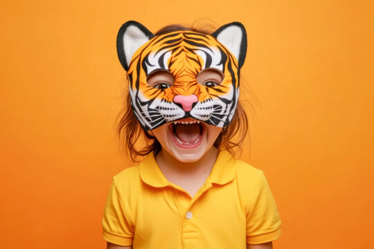 Cheerful child wearing a tiger mask against vibrant orange background, playful expression