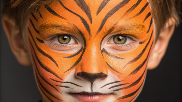 A child with tiger face paint, showcasing vibrant orange and black stripes, gazes intently at the camera, evoking a playful and imaginative spirit.
