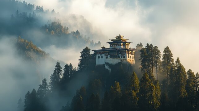 Bhutan. Misty View of Tiger's Nest Monastery: Historical Buddhist Temple in Asia