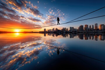 A person balances on a tightrope at sunset over a city skyline and calm water