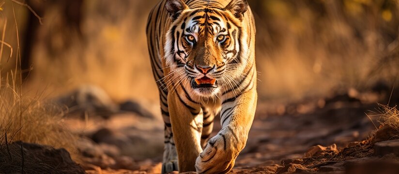 A tigress approaches a photographer in Pench tiger reserve Copy space image Place for adding text or design