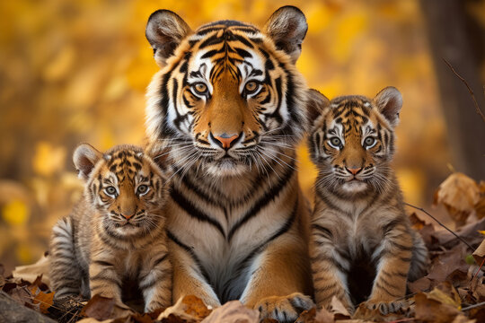A majestic tigress leads her two adorable cubs on a forest trail in an enchanting autumn setting