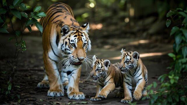A majestic tigress with her two adorable cubs in a lush, green forest. The tigress stands protectively, while the cubs explore their surroundings
