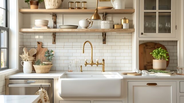 A bright and airy kitchen with open shelving a farmhouse sink and subway tile backsplash The space is complemented by brass fixtures and natural wood accents