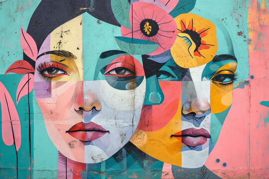 Street art mural graffiti depicting the face of an attractive woman with large eyes, surrounded by geometric patterns and vibrant colors.