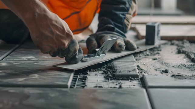 The process of laying ceramic floor tiles. Large format ceramic tiles. A tiler lays ceramic floor tiles on adhesive using a tile leveling system. Leveling system for ceramic floor tiles.