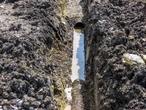 Open cut trench to expose damaged HDPE perforated drainage tile