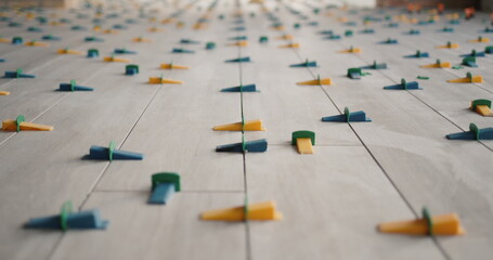 Laying tiles concept with close up hands. Tiler, spatula and glue when laying tiles. Pull tabs and wedges for leveling system.