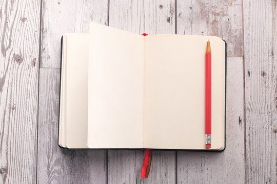 Variety of notebooks and notepads on tiled desk flatlay from above