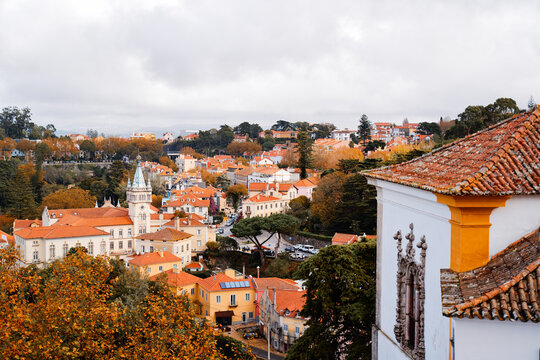 Panoramic view of Sintra town with tiled rooftops and church spire seen from hilltop near the National Palace in Portugal.