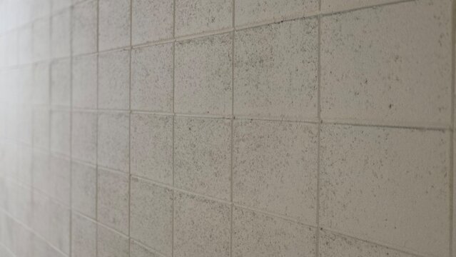 A modern wall design features a pattern of varying rectangular tiles in a light, neutral hue. The arrangement creates a geometric and textured appearance. #tilepattern #moderndesign