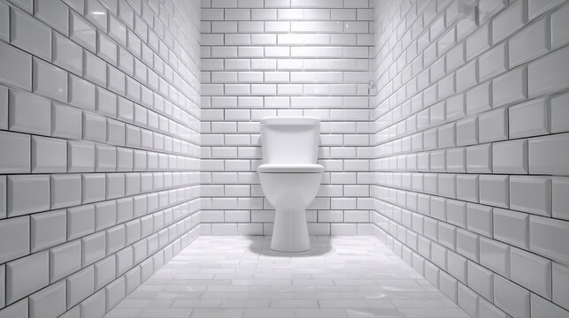 Minimalistic white toilet centered in a bright room fully covered with glossy white subway tiles on walls and floor creating a modern clean design