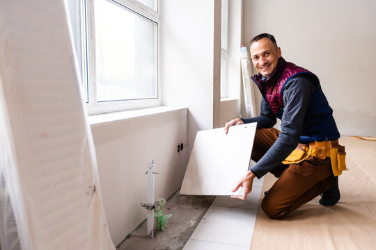 Tile installer, a man laying floor tiles in a new home, demonstrating the expertise and precision of a professional contractor