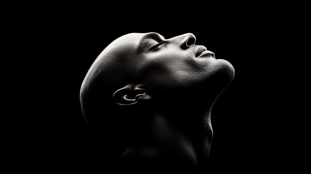 Young man gazing upward with contemplative expression in dramatic low-key portrait
