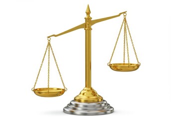 Golden balance scale on white background, representing law and justice, with tilted pans