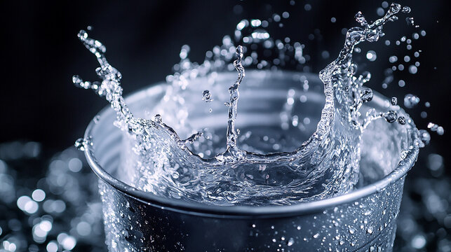 Water pouring out of a tilted bucket mid-motion splash