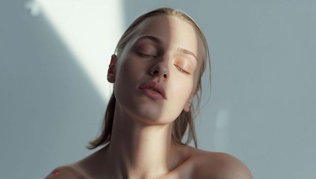 Serene woman closing eyes in soft veil lighting, bare-shoulder beauty portrait for skincare