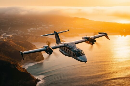 Private jet flying over coastline at sunset. Modern aviation concept. Travel background. Passenger airliner, business aircraft. Design for banner, poster