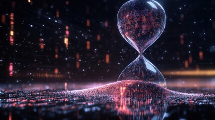 A digital hourglass with binary code stands prominently on an advanced technology circuit board, symbolizing time and data