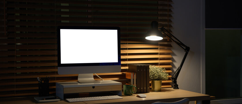 Workspace peaceful night time computer empty screen with office supply