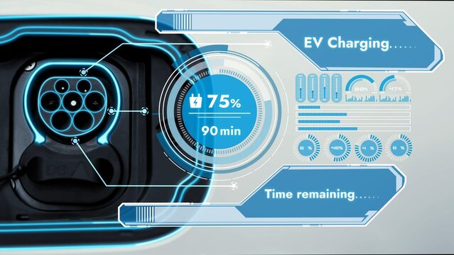 Closeup front view EV charging port with technological advancement of future innovative hologram display digital smart data of battery status and time of recharging by intelligence artificial. Peruse
