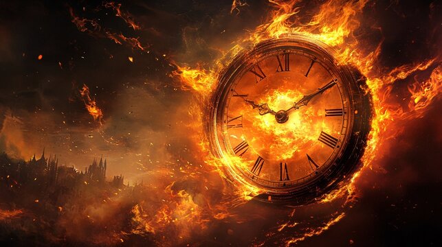 Vintage clock consumed by fire, representing the fleeting nature of time