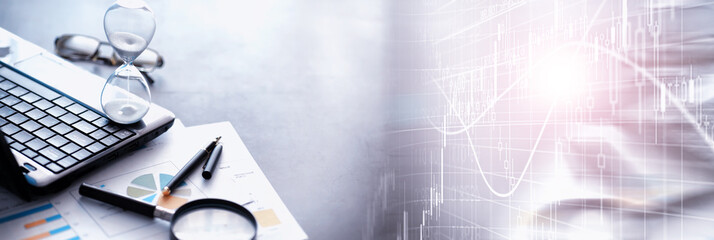 Working time symbolizes an hourglass. Office desk of insurance manager and banker. Office employee at the table. The concept of lack of time.