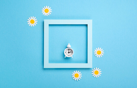 Alarm clock with a yellow maple leaf placed on a tree stump in a sunlit autumn forest with a blurred background. Symbolic image representing daylight saving time and fall season change