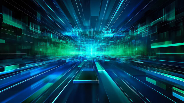 Abstract digital landscape depicting a futuristic blue and green grid moving rapidly through space and time during a nighttime scene