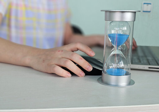 Blue Hourglass With Glowing Sand And Digital Background Design