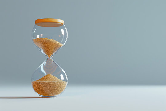 Illustration of a traditional hourglass with the last grains of sand falling, emphasizing the final moments of a countdown, placed against an empty grey background with space for additional messaging