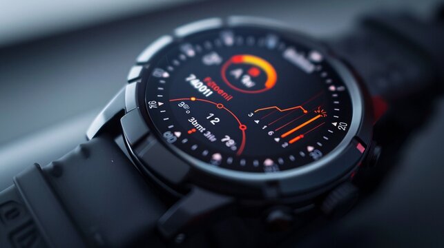 Closeup of a high tech digital watch with a sleek modern design featuring a dashboard style dial with various gauge indicators and digital readouts displaying time measurements and other data