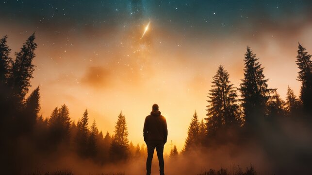A lone figure stands amidst a forest, staring at a shooting star piercing the mystical night sky, igniting feelings of wonderment and cosmic reflection.
