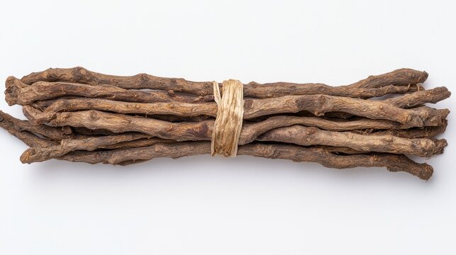 A rustic bundle of natural wooden twigs tied tightly together with a thick jute rope