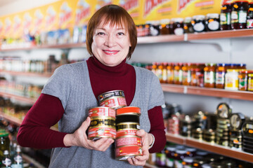 Female customer holding tin canned goods in the food store.