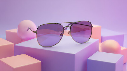 Black aviator sunglasses with tinted lenses positioned artistically on geometric pastel purple shapes, presenting a modern fashion aesthetic
