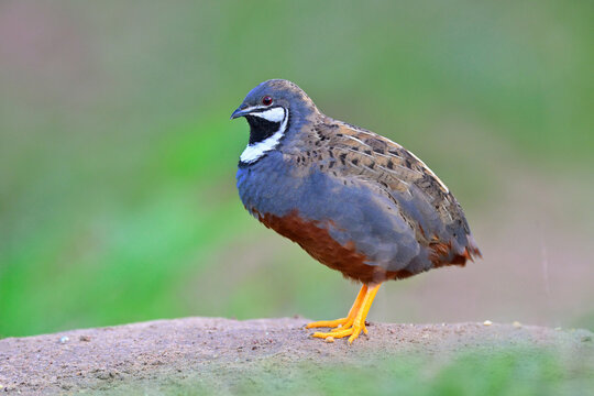 Elegant vibrant bird animal on moss-covered log with neutral backdrop