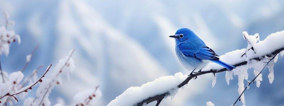 Little frozen blue bid sits on a snow-covered branch on frosty snowy morning. Bird in forest, wildlife scene from nature. First snow. Winter time concept