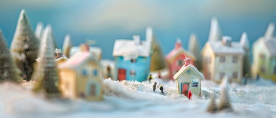 Enchanting miniature snow-covered village with colorful houses and tiny figures captures the whimsy of a winter wonderland.