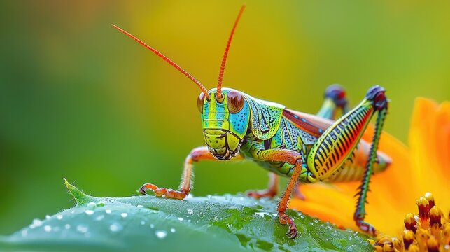 A close-up view of a grasshopper perched on a green leaf, showcasing vibrant colors and textures, Ideal for nature themes, ecology studies