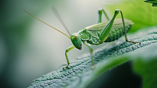 Grasshopper's Regal Perch: A majestic grasshopper, with intricate details, perches regally on a moss-covered branch amidst a lush, verdant rainforest, showcasing the delicate balance of the wild.