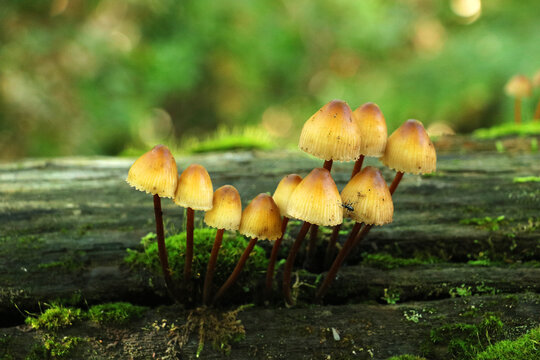 Rain is falling on orange mushrooms, Marasmius siccus or umbrella mushroom