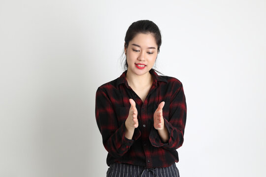 Closeup view stock photography  of beautiful white manicured female hand showing small size of virtual invisible object with help of two fingers isolated on blue background