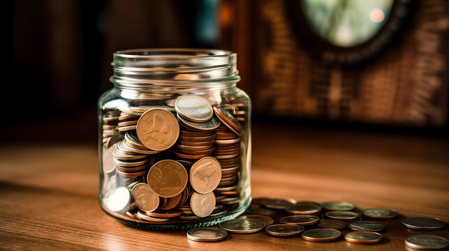 Coins in a glass jar on a wooden surface reflecting financial abundance