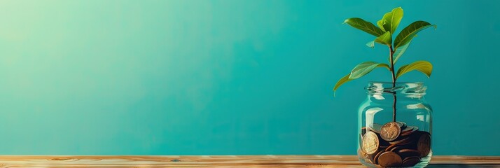 Small plant growing from coins in a glass jar