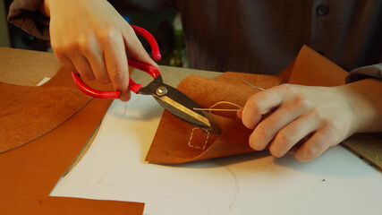 An experienced tanner in the process of creating a women's handbag. Cuts off the excess sartorial thread and seals the tip with a lighter.